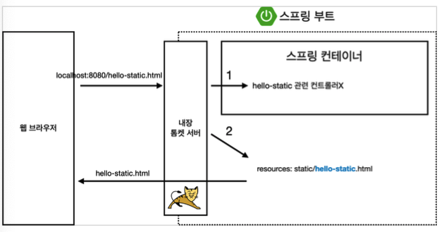 - 웹브라우저에서 localhost:8080/hello-static.html을 치면 내장 톰켓 서버가 요청을 받고