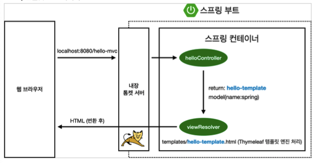 - 웹브라우저에서 localhost:8080/hello-mvc를 넘기면 스프링 부트 띄울 때 같이 띄우는 내장 톰켓 서버로 넘어간다.