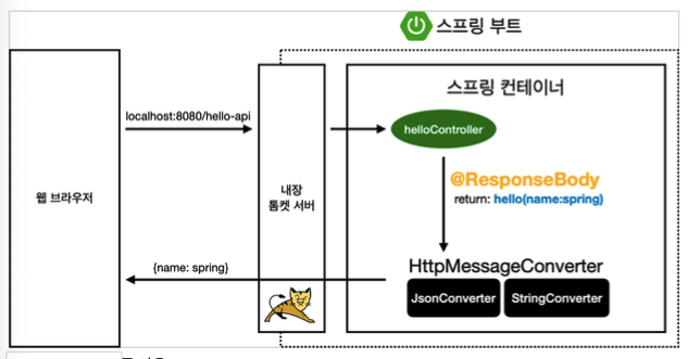 - localhost:8080/hello-api를 치면 내장 톰켓 서버에서 hello-api이 왔다고 스프링에 넘겨준다.
