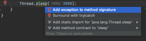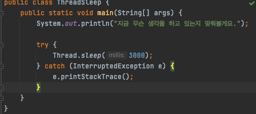 이렇게 Thread.sleep 코드를 입력하면 sleep에 빨간 줄이 뜨는 것을 볼 수 있다.