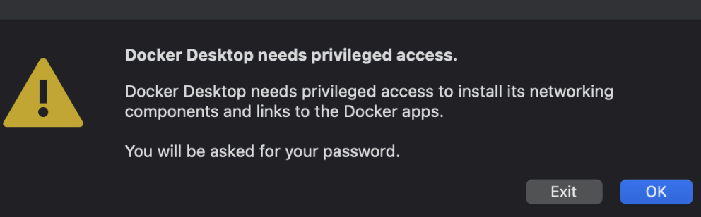 3. 도커 아이콘을 더블 클릭하여 실행시키고, 아래와 같은 팝업에서 OK를 클릭한다.