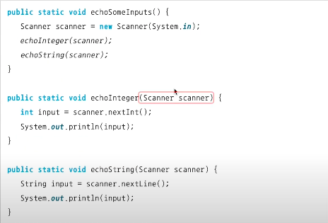 밑의 두 변수를 scanner를 인자로 받는 메소드로 변경하고, echoSomeInputs()에서 scanner를 한번만 생성해서 각 메소드들로 전달해주게 된다. 하지만 이 방법도 조금 불편한 점이 발생하게 된다. 매 메소드 호출시마다 스캐너를 인자로 입력해줘야 한다는 것이다.