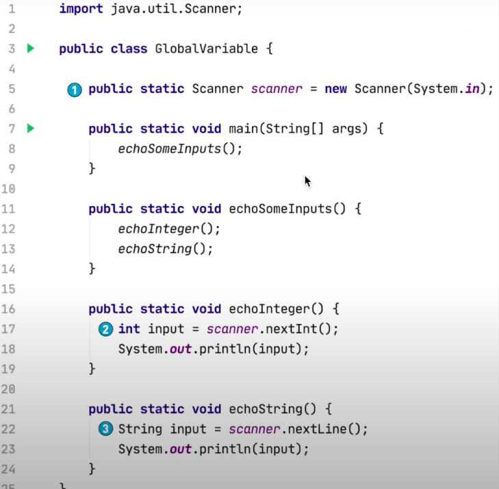 변수들은 자신이 속한 메소드 안에서만 사용될 수 있는데, 여기 scanner(①)는 각 메소드들의 중괄호 블록보다 바깥에서 선언되었기 때문에 각각의 메소드 안에서도 사용할 수 있는 것이다.