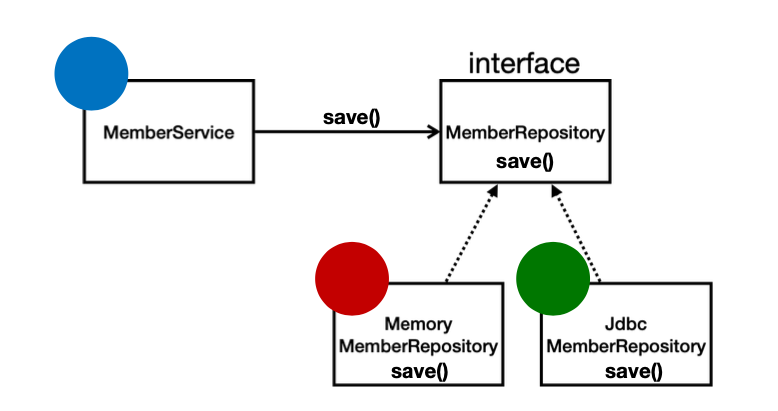 - 장점 : 다형성로 인터페이스를 구현한 객체를 실행 시점에 유연하게 변경할 수 있다.