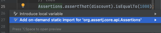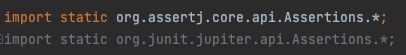 코드가 간결해지면서 상단에 import static이 생긴다. import 한 후 부터는 Assertions 없이 asserThat만 바로 사용할 수 있다.